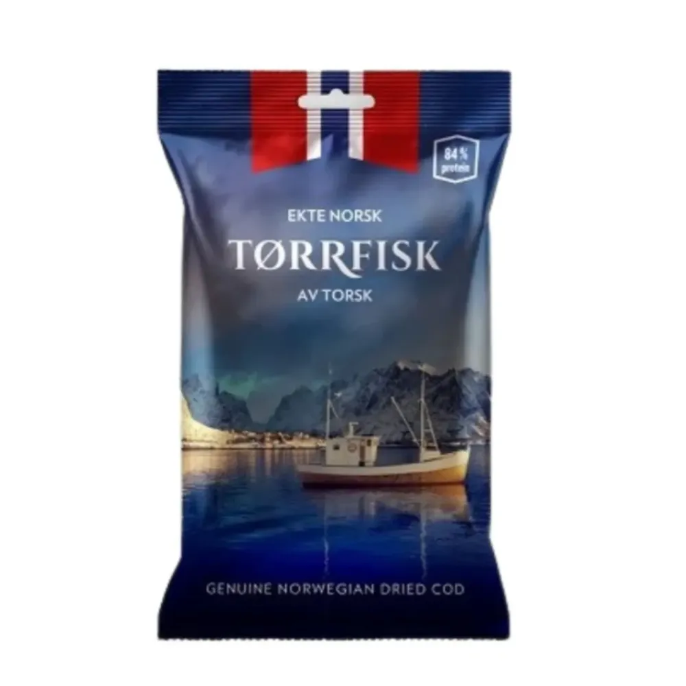 Ekte Norsk Tørrfisk av torsk er snacks laget av førsteklasses råstoff fra Nord-Norge. Et rent naturprodukt som er nydelig på smak og med rikelige mengder protein. Perfekt som mellommåltid i farta eller sunn snack.