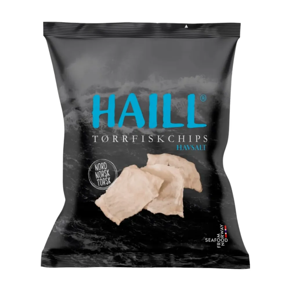 Tørrfiskchips Havsalt&Olivenolje 30g Haill er et produkt levert av Meyer ottesen engros og produktet inneholder 357.00 kcal per 100g, hvorav 3.40 g er fett, 81.90g er proteiner og 0.00 g er karbohydrater.